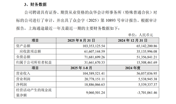 上海通途2025年1—8月实现营收1.05亿元,净利润为1888.61万元。2024年营收、净利润分别为5605.70万元、553.93万元。