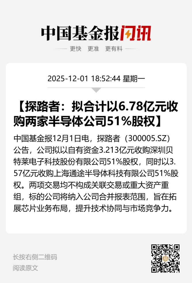 12月1日晚间,探路者公告称,拟合计以6.78亿元分别收购两家芯片公司51%股权。具体来看,探路者拟以3.21亿元收购深圳贝特莱电子科技股份有限公司(以下简称贝特莱)51%股权,以3.57亿元收购上海通途半导体科技有限公司(以下简称上海通途)51%股权。