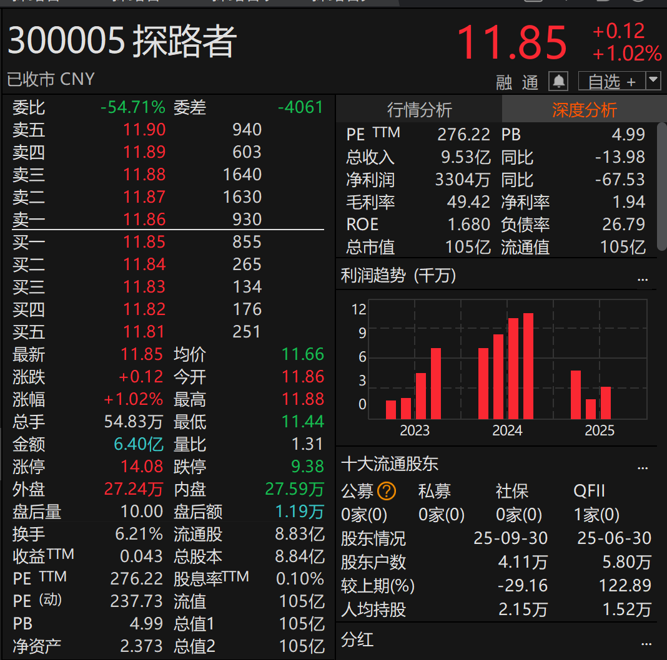 截至12月1日收盘,探路者报11.85元/股,总市值为105亿元。