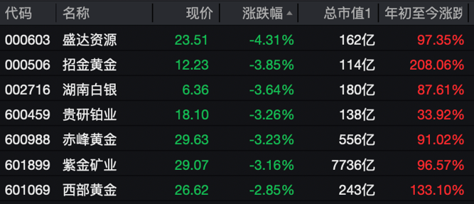 A股贵金属板块领跌。盛达资源、招金黄金、湖南白银、赤峰黄金等领跌。