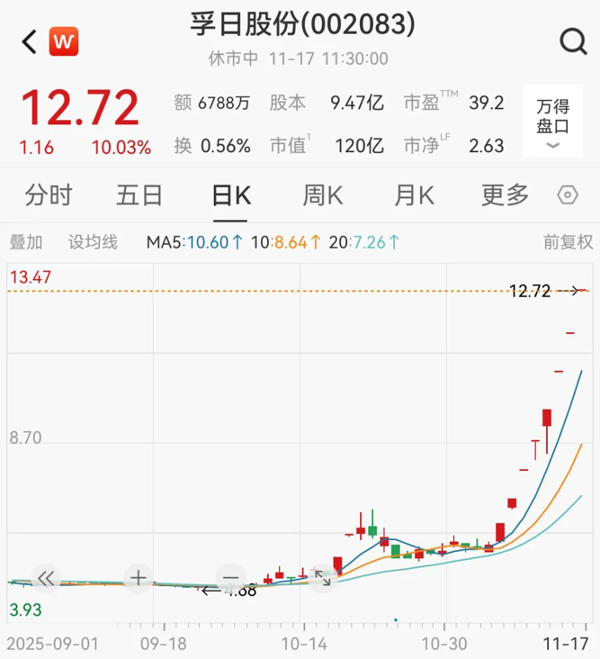 孚日股份连收8个涨停板,截至午盘报12.72元/股,最新市值为120亿元。