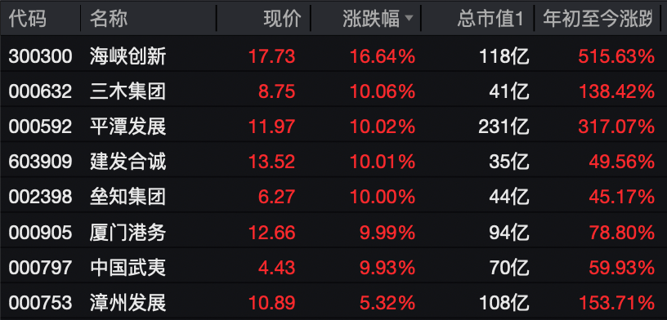 相关个股掀涨停潮。平潭发展走出22天14板、三木集团录得7连板,建发合诚、垒知集团、厦门港务、中国武夷等纷纷涨停,海峡创新大涨超16%。