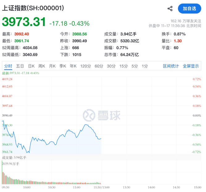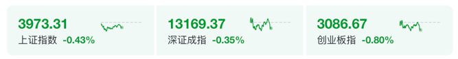 截至午间收盘,沪指报3973.31点,跌0.43%;深证成指跌0.35%,创业板指跌0.8%。