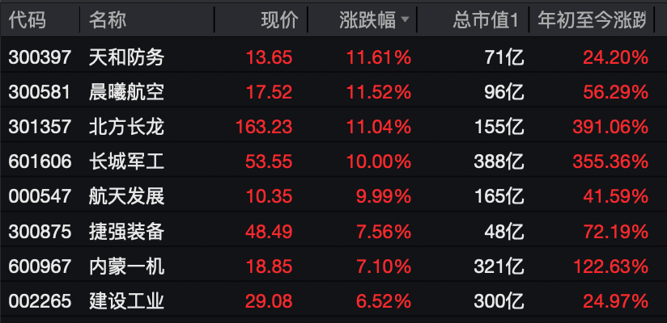 个股方面,长城军工、航天发展录得10cm涨停,天和防务、晨曦航空、北方长龙涨超11%,中航成飞、中航沈飞涨超2%。