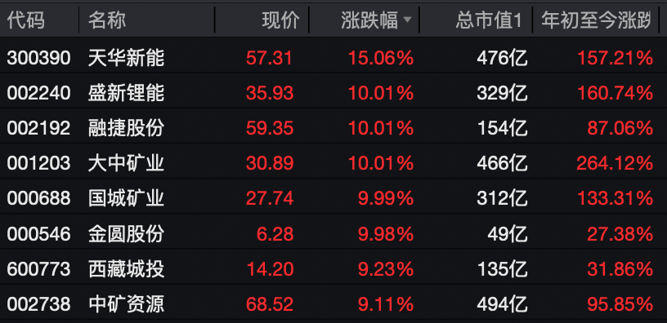 涨幅方面,盛新锂能、融捷股份、大中矿业、国城矿业、金圆股份等均录得10cm涨停。
