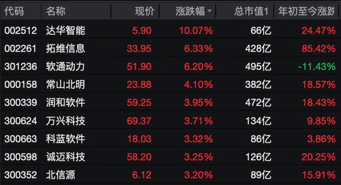 个股方面,宣亚国际录得20cm涨停,三六零、达华智能、湖北广电涨停,高伟达、拓维信息、软通动力等涨幅居前。