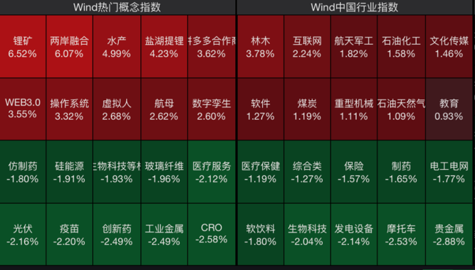 从板块看,锂矿板块领涨市场,福建自贸区板块再度爆发,航天军工板块延续涨势,AI应用概念板块走强;而贵金属板块明显回调,创新药、大金融板块走弱。