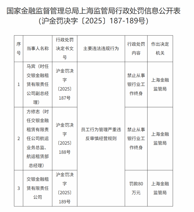 11月19日,国家金融监督管理总局上海监管局公布的行政处罚信息公开表显示,交银金融租赁有限责任公司被罚款80万元,原因是员工行为管理严重违反审慎经营规则。