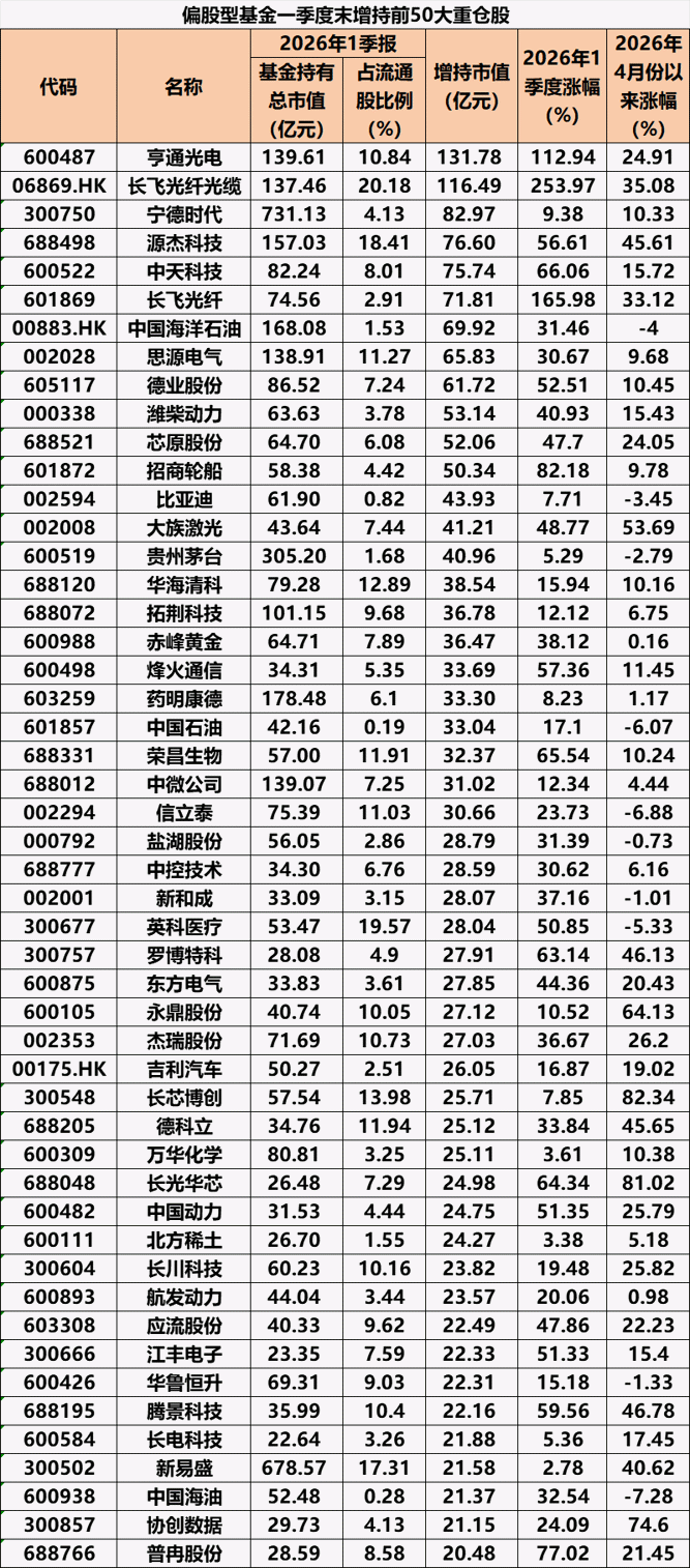 从反映公募基金投资偏好的增持前50大重仓股来看,光通信“龙头股”受到公募青睐,获较多增持,亨通光电、长飞光纤光缆等增持市值均超过百亿元。