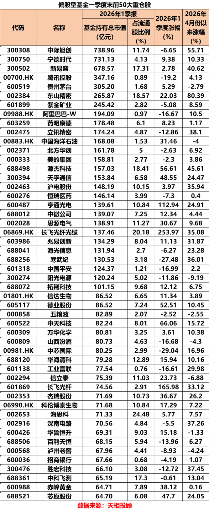 天相投顾数据显示,截至今年一季度末,纳入统计的5458只积极投资偏股型基金的前十大重仓股分别为:中际旭创、宁德时代、新易盛、腾讯控股、贵州茅台、东山精密、紫金矿业、阿里巴巴-W、药明康德、立讯精密。