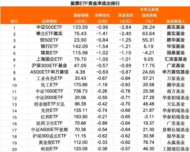 从资金净流出情况来看,上周五当天,股票ETF中仅6只资金净流出金额超过1亿元,中证500、沪深300等宽基ETF,以及稀土、银行等行业主题ETF“失血”较多。