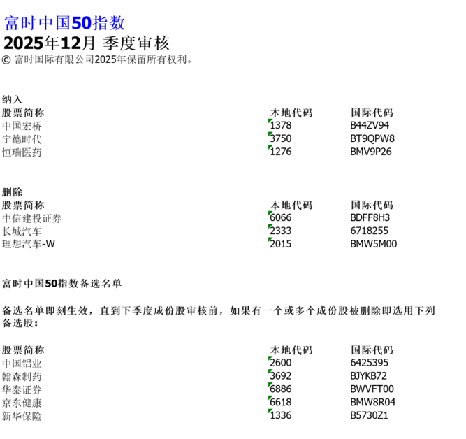 12月3日,富时罗素宣布对富时中国50指数、富时中国A50指数、富时中国A150指数等的季度审核变更。该变更将于2025年12月19日星期五收盘后(即2025年12月22日星期一)生效。