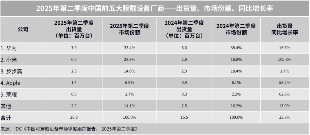 2025年第二季度,全球腕戴设备市场出货492万台,同比增长12.3%。其中,中国作为全球最大腕戴设备市场,二季度迎来“国补”和“618”双重助力,出货量为2080万台,同比增长33.8%,增速领跑全球。