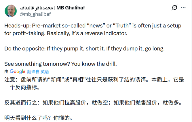 此前,伊朗议会议长卡利巴夫发文吐槽特朗普,他指出:“提醒一下,盘前所谓的“消息”或“真相”往往只是为获利了结设下的圈套。说白了,这其实是个反向指标。应该反其道而行之:如果他们拉高价格,就做空;如果他们抛售,就做多。明天要是看到这种情况,你就知道该怎么做。”