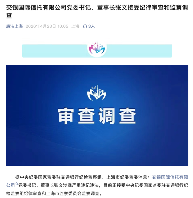 4月23日,“廉洁上海”官微通报:交银国际信托有限公司党委书记、董事长张文涉嫌严重违纪违法,目前正接受中央纪委国家监委驻交通银行纪检监察组纪律审查和上海市监察委员会监察调查。