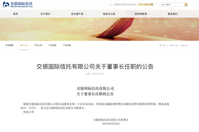 2025年3月,交银国际信托召开董事会、股东会,选举张文担任公司董事长。不久后,湖北金融监管局核准张文交银国际信托有限公司董事长的任职资格。
