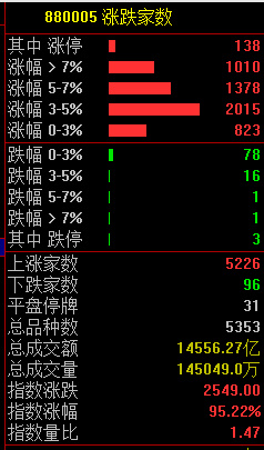 市场共5226只个股上涨,138只个股涨停,96只个股下跌。