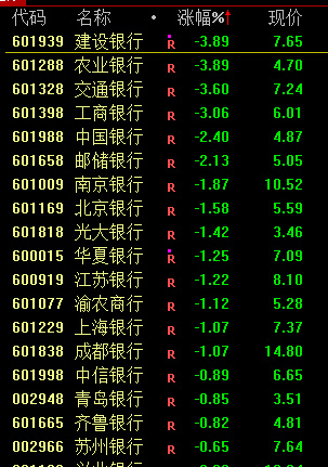 下跌方面,银行股冲高回落,农业银行、工商银行、建设银行跌超3%。