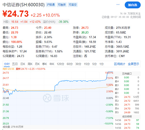 券商龙头股中信证券尾盘涨停,成交超65亿元,该股也是自2023年7月28日以来首度涨停。