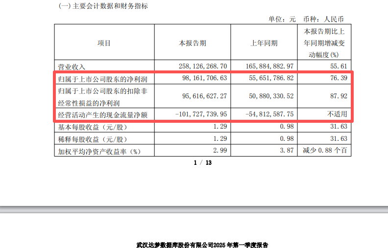 2025年第一季度,达梦数据实现归母净利润9816.17万元,同比增长76.39%;经营活动产生的现金流量净额为-1.02亿元,而2024年第一季度末为-5481.26万元。