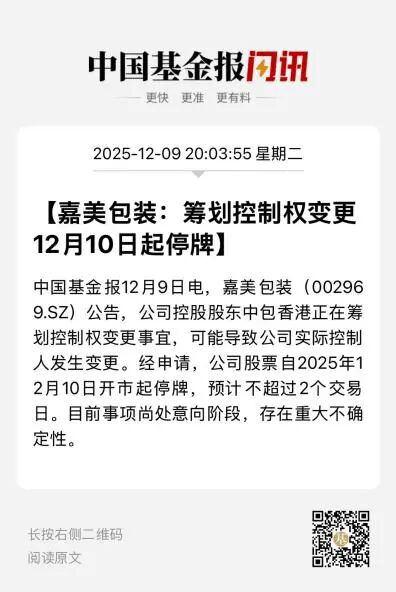 12月9日,嘉美包装公告称,公司控股股东中包香港正在筹划控制权变更事宜,可能导致公司实际控制人发生变更。经申请,公司股票自2025年12月10日开市起停牌,预计不超过2个交易日。目前事项尚处于意向阶段,存在重大不确定性。