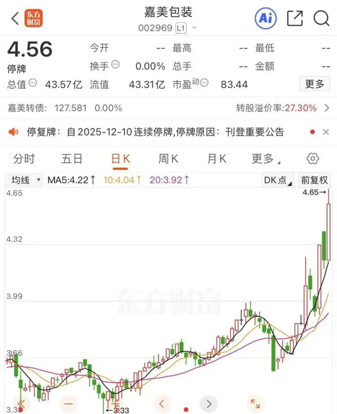 值得注意的是,近期嘉美包装的股价持续攀升,12月5日实现涨停,12月8日回调收跌2.08%,次日又再度大涨7.80%,近三个交易日累计涨幅超16%。