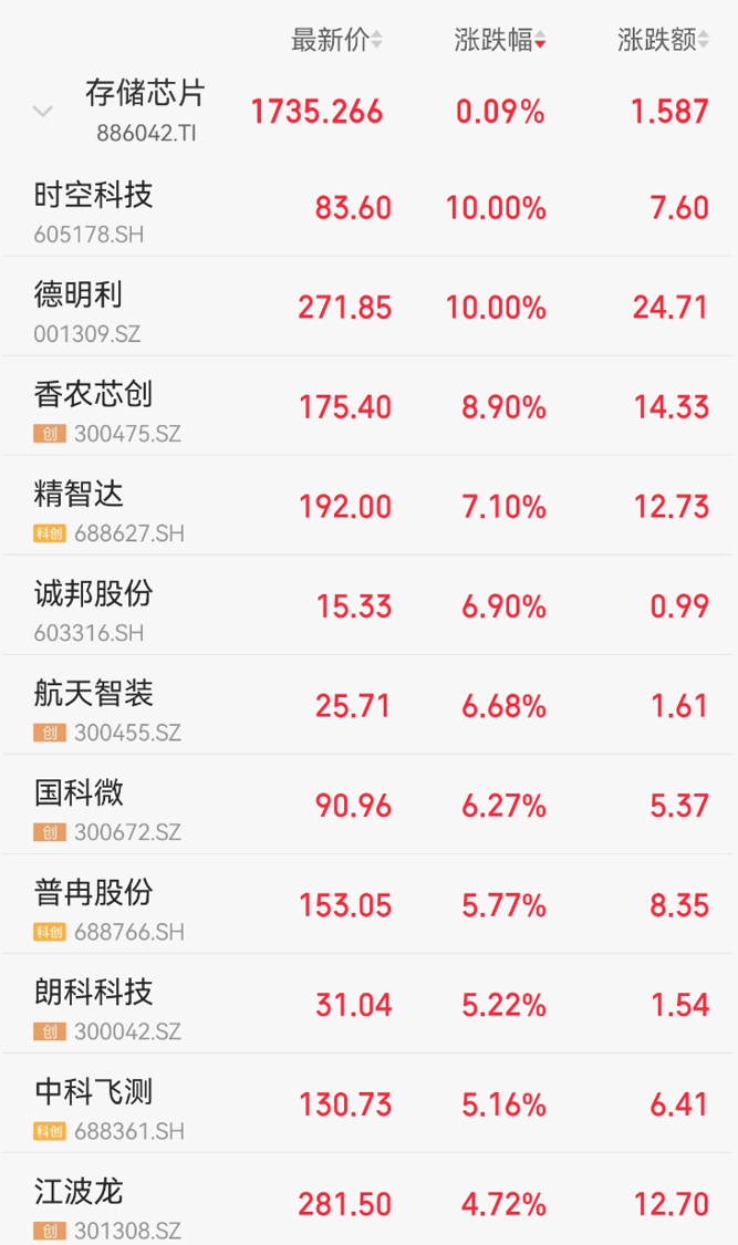 时空科技午前触及涨停,香农芯创涨近9%,普冉股份、江波龙等跟涨。