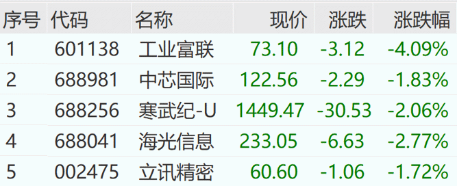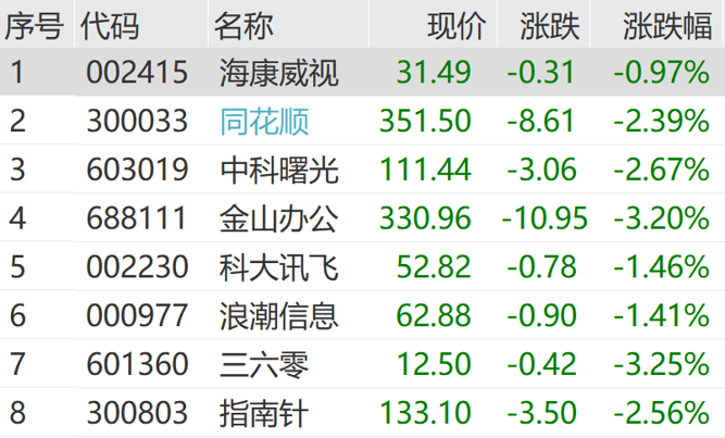 个股方面,金山办公、三六零跌超3%,中科曙光、指南针、同花顺、寒武纪、海光信息等跌超2%。