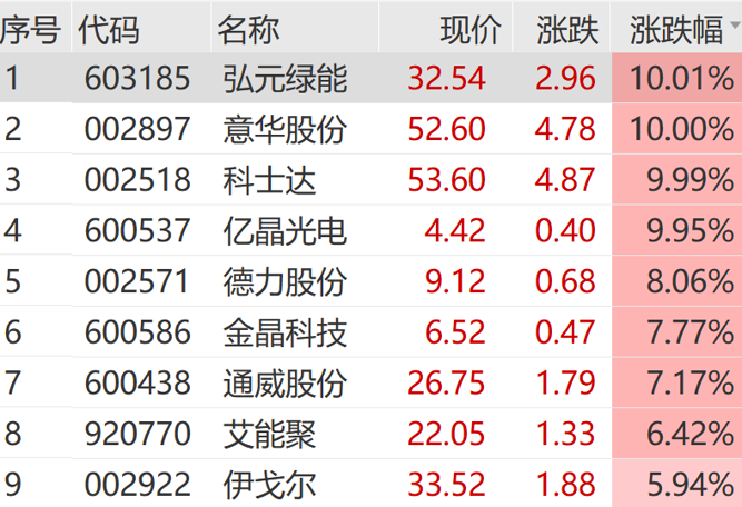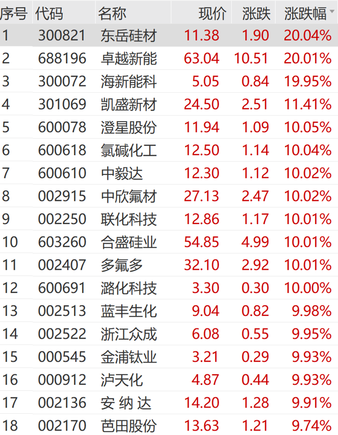 个股方面,东岳硅材、海新能科、卓越新能等20cm涨停,澄星股份、氯碱化工、中毅达、中欣氟材等十余股集体涨停。