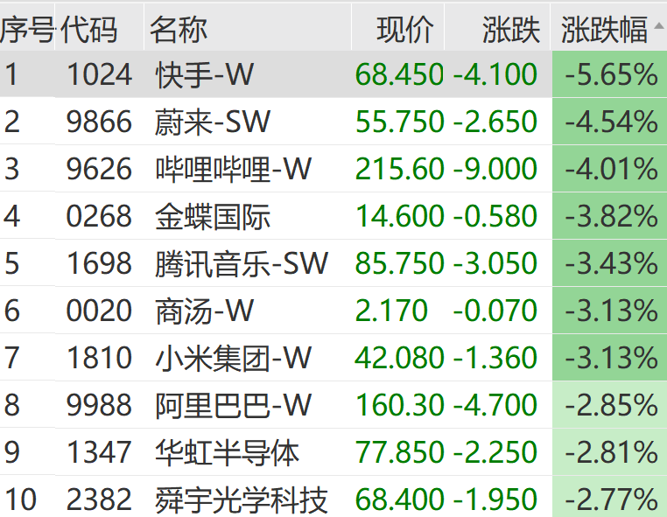 港股市场震荡下探,恒生指数、恒生国企指数跌超1%,恒生科技指数跌2%。快手跌超5%,领跌恒生科技指数成份股。