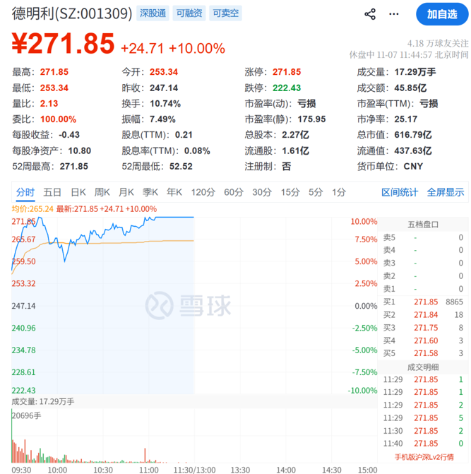 11月7日上午,存储芯片概念股局部活跃。德明利午前封住涨停,实现两连板,股价报271.85元/股,再创历史新高。