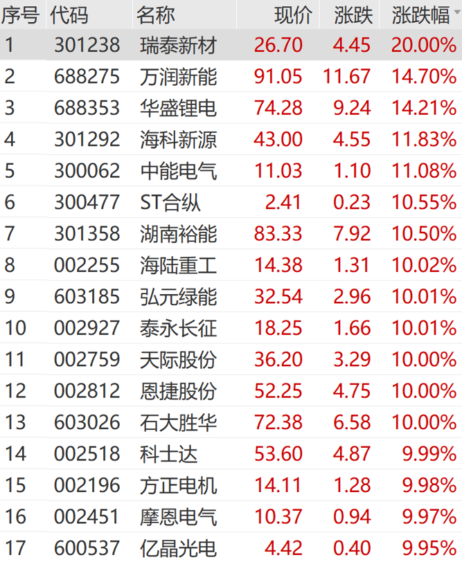 电力设备板块同步走高,锂电股大爆发。瑞泰新材20cm涨停,天际股份、恩捷股份等十余股涨停。