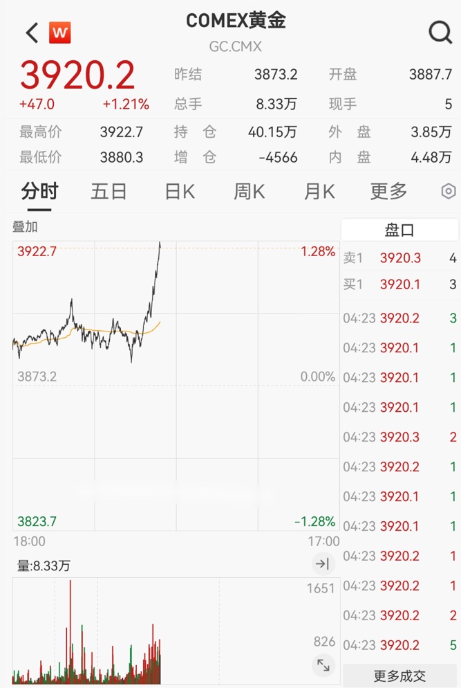 COMEX黄金同步拉升,日内涨超1%,截至发稿报3920.2美元/盎司。