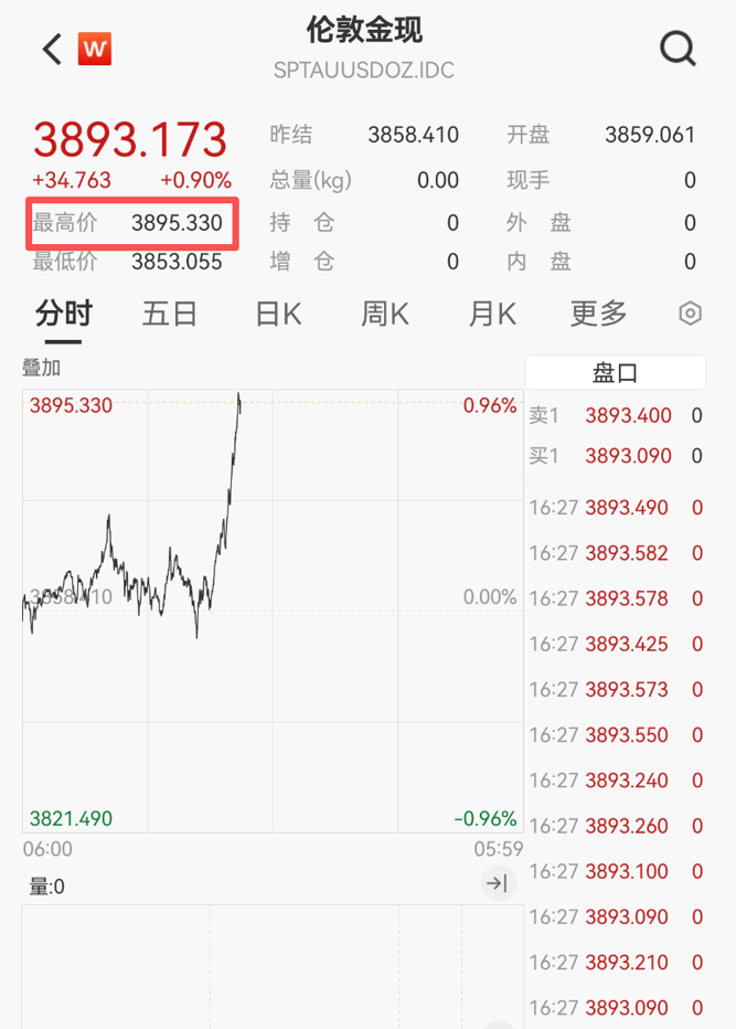 10月1日,现货黄金短线拉升,站稳3890美元/盎司大关。截至记者发稿,伦敦金现最高价突破3895美元/盎司,再创历史新高。
