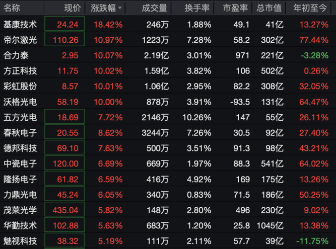 此外,电子元器件板块快速拉升,合力泰、方正科技、彩虹股份、沃格光电等多股涨停。
