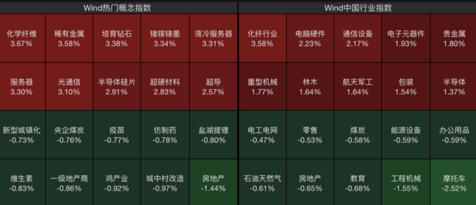 从板块上看,液冷服务器概念股反复走强,通信设备、电子元器件、航天军工等板块表现活跃;房地产、农业、工程机械等板块震荡调整。