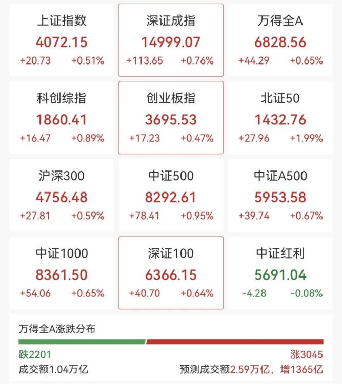 4月20日早盘,A股主要指数涨跌不一,随后创业板指拉升翻红。截至发稿,沪指涨0.51%,深成指涨0.76%,创业板指涨0.47%。此外,科创综指涨0.89%,北证50指数一度涨超2%。