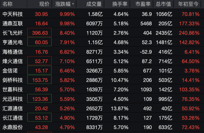 通信设备板块震荡走高,中天科技、通鼎互联率先涨停,长飞光纤、亨通光电、海格通信等均涨超6%。