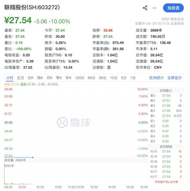 4月20日,联翔股份开盘跌停,股价最新报27.54元/股,总市值约为29亿元。