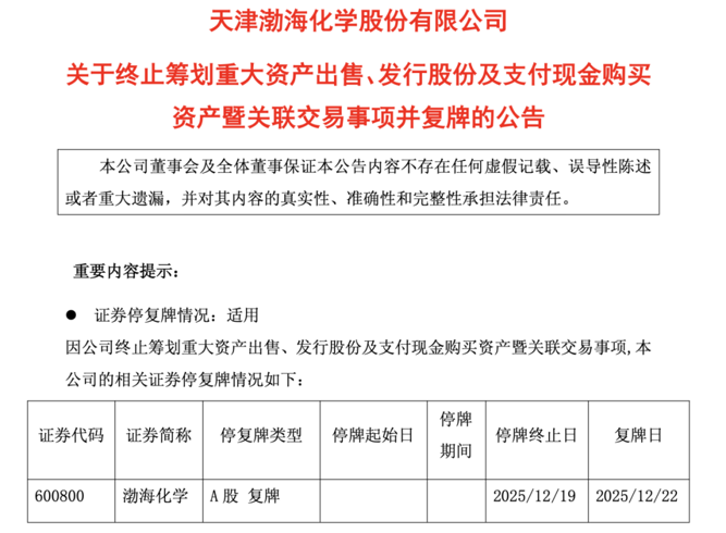 12月19日,渤海化学发布公告称,由于双方未能就交易方案部分核心条款达成一致,公司决定终止筹划重大资产出售、发行股份及支付现金购买资产暨关联交易事项。