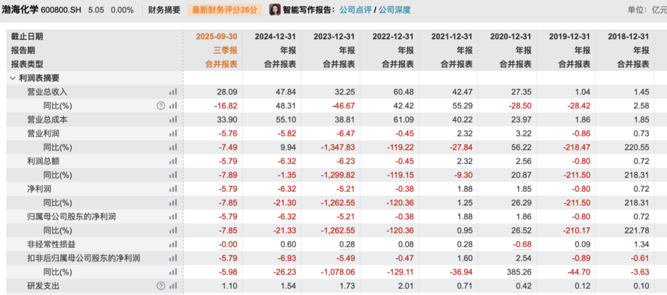 此次停牌前,渤海化学曾提前涨停。截至12月5日收盘,该股报5.05元/股,总市值为56亿元。