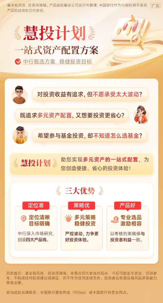 中国银行“慧投计划”严选全市场优秀基金产品管理人,通过选品、重检等闭环流程,为投资者提供了定位清晰、目标明确的资产配置解决方案。另外“慧投计划”基于多元资产配置理论,通过成长、红利等不同策略,力争在不过多抬高风险暴露的前提下,为投资者创造更好的投资体验。