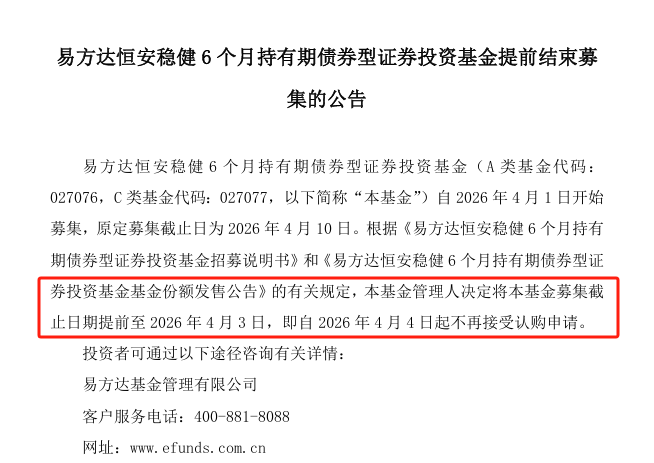近日,易方达恒安稳健债券基金宣布提前结束募集,原定募集截止日由4月10日提前至4月3日,自4月4日起不再接受认购申请。