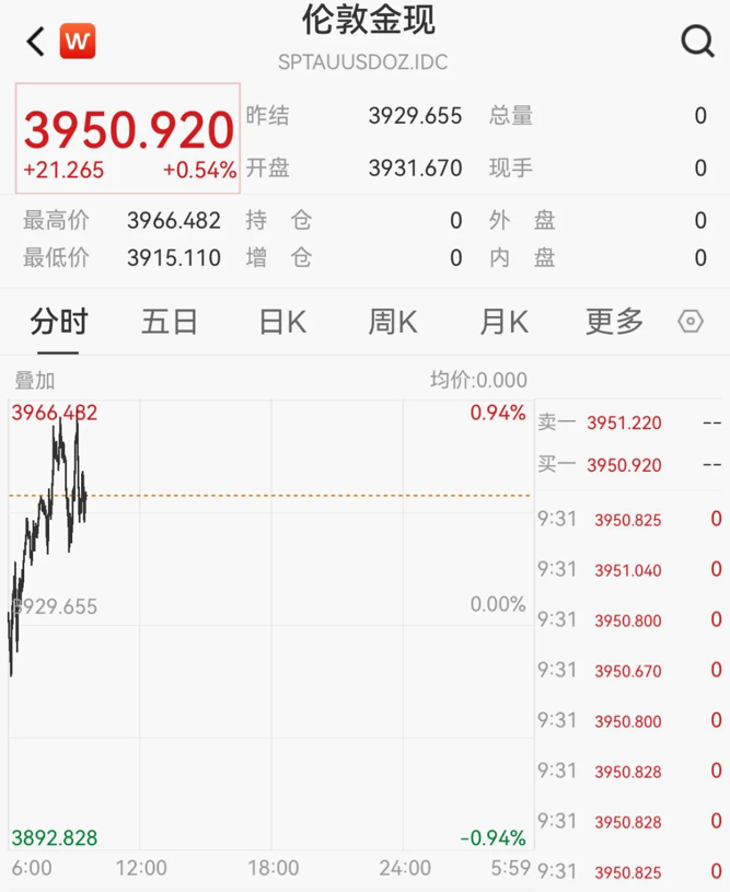 国际金价持续大幅震荡。截至发稿,现货黄金报3950.92美元/盎司,日内涨0.54%。