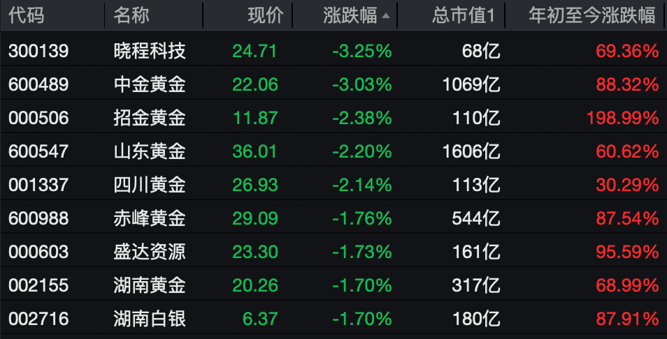 个股方面,晓程科技跌逾3%,中金黄金、招金黄金、山东黄金、四川黄金等相关个股纷纷下跌。