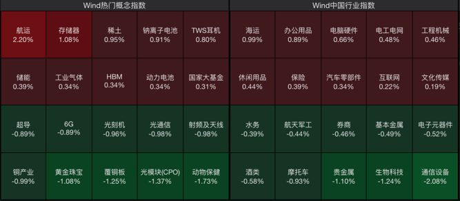 从板块看,港口航运、存储芯片板块领涨,通信设备、贵金属板块领跌。