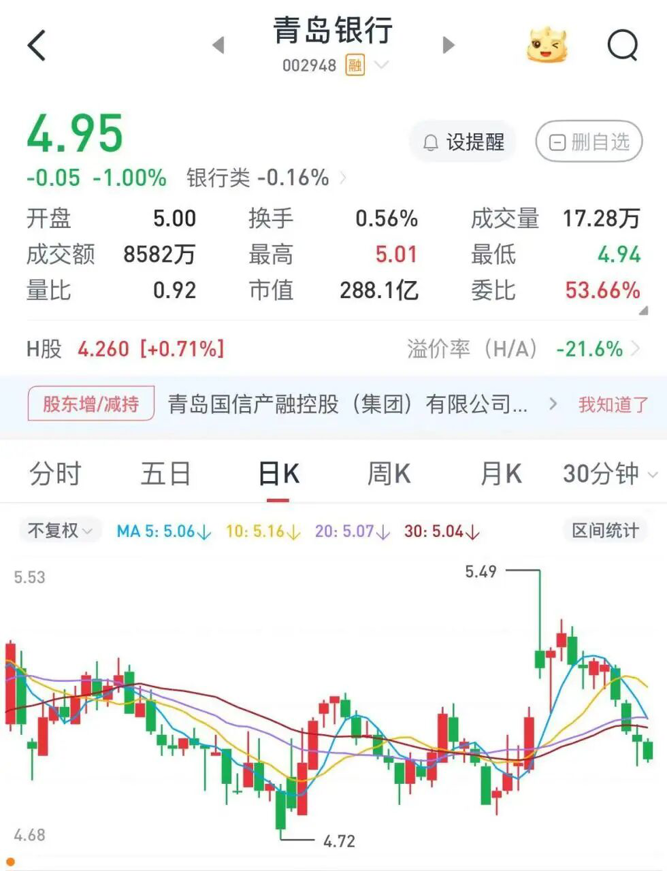 截至9月17日午间收盘,青岛银行A股报4.95元/股,总市值为288.1亿元。