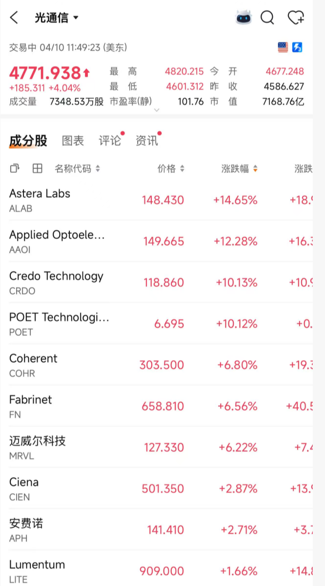 个股方面,美股光通信概念涨幅持续扩大,Astera Labs大涨超14%,AAOI涨超12%,Credo Technology涨超10%,Coherent涨超6%。