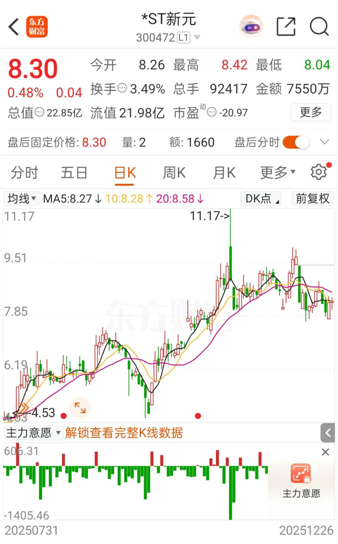 截至12月26日,*ST新元报8.30元/股,总市值为22.85亿元。