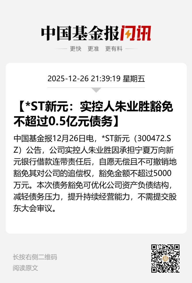 12月26日晚间,*ST新元(证券代码:300472)公告称,产业投资人北京随锐新元创新科技中心(有限合伙)及随锐科技集团股份有限公司拟协调关联方向公司无偿赠与不超过3.3亿元的现金资产。同时,公司实控人朱业胜决定豁免子公司宁夏新元对其个人的债务,豁免金额不超过0.5亿元。